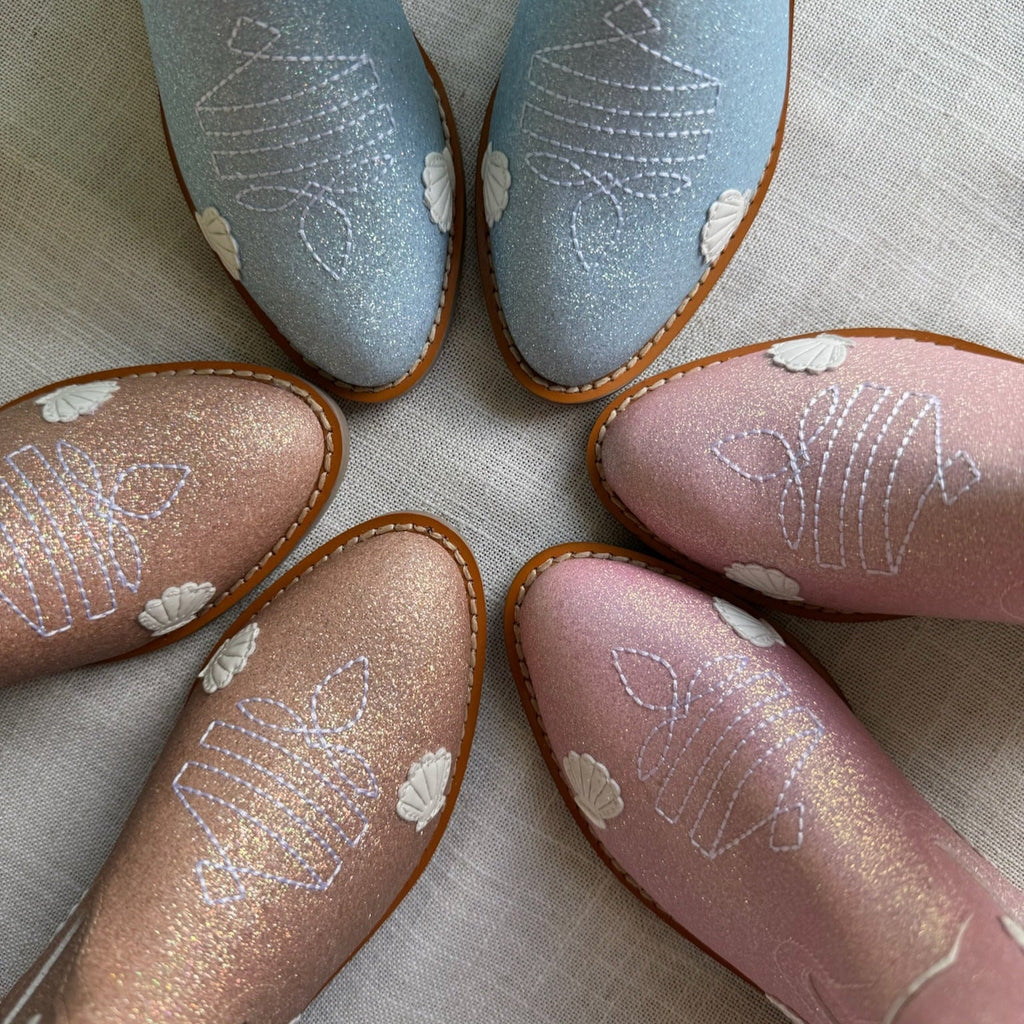 The Coral Cove Boots are designed in a soft coral-pink glitter — inspired by cotton candy skies and the glow of golden hour. Featuring puffy shell details, hand-stitched piping, and custom toe stitching, they bring the perfect pop of color to every beachy cowgirl adventure.