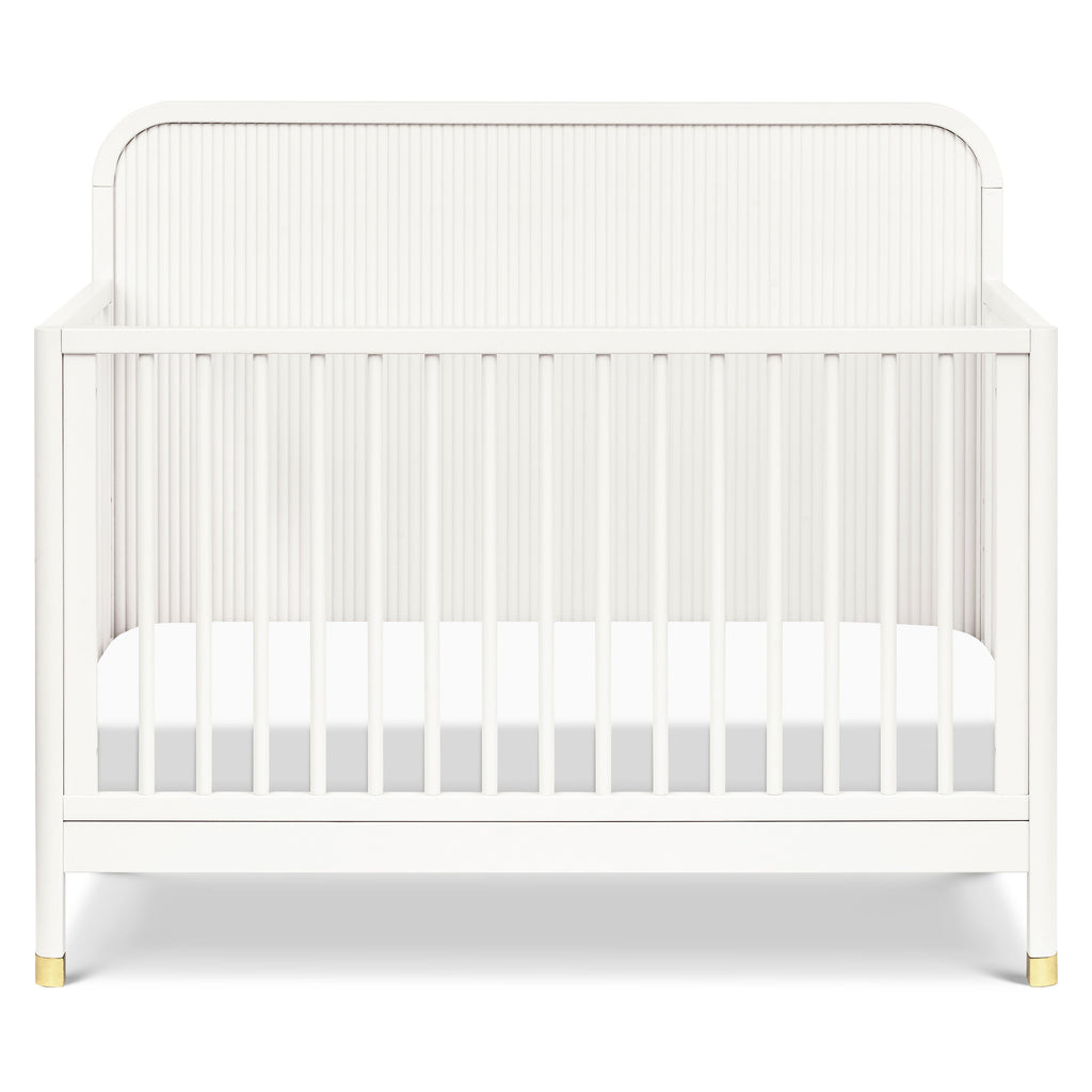 Create a nursery that exudes timeless elegance with the Brimsley Tambour 4-in-1 Convertible Crib. This beautifully crafted piece features a distinctive tambour panel headboard with gently curved slats and refined gold metal feet—making it a standout statement in any space.