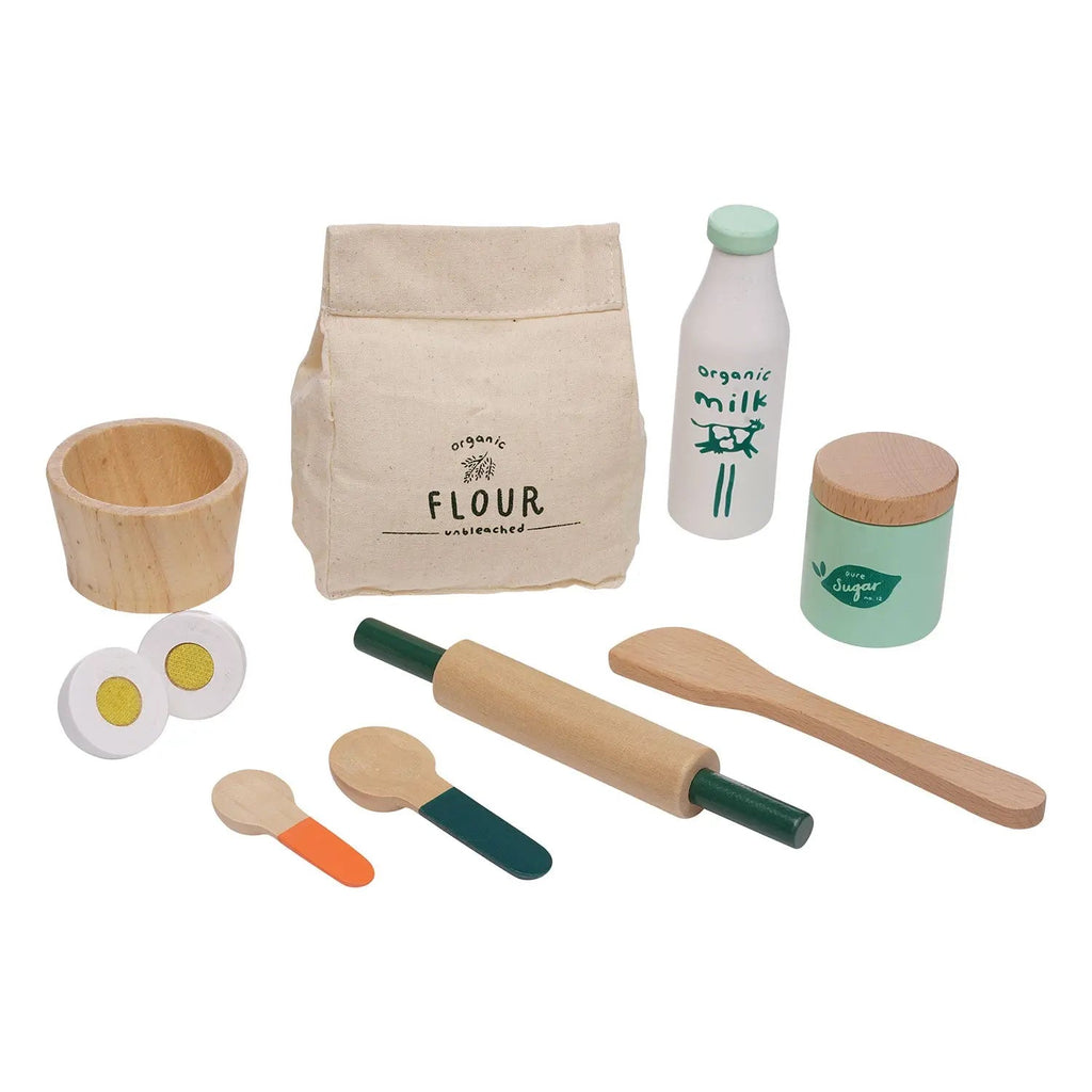 Mix-up toddler play time with the Bunny Hop Mixer! The ten-piece wood set includes one bunny-themed mixer, one mixing bowl, one small spoon, one large spoon, one rolling pin, one spatula, one sugar jar with removable lid, one milk bottle with removable cap, one egg - two halves that attach to one another and one fabric flower bag. Pull back on the handle between the bunny ears to lift the wooden mixer blades and turn the mushroom to make them spin. Encourages imaginative role-play, cause and effect learning and motor skill development.