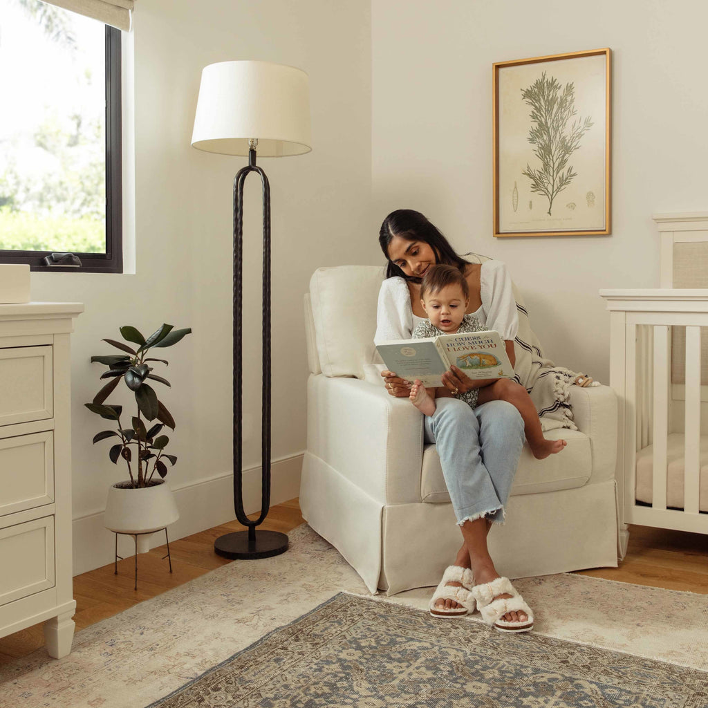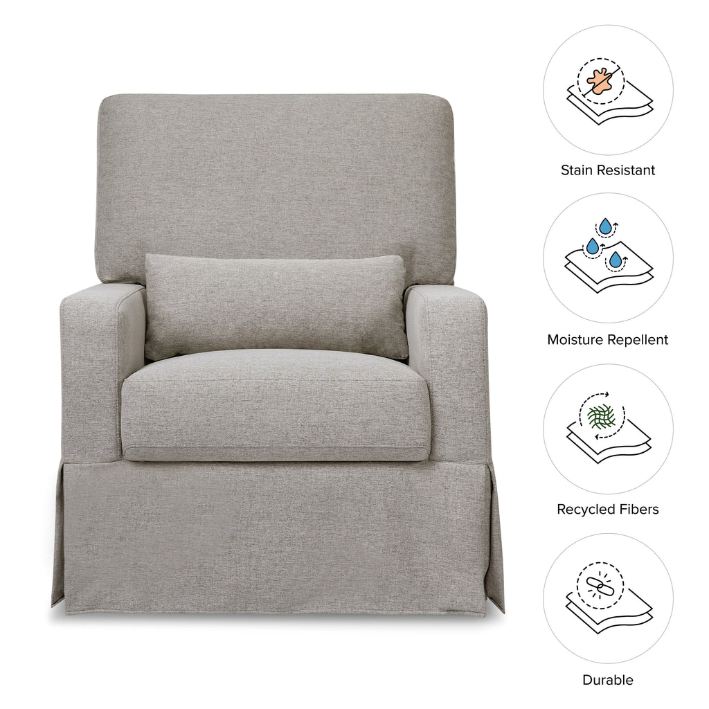 The Namesake Crawford Pillowback Comfort Swivel Glider offers a modern take on traditional slipcover style, bringing nursery comfort to a new level with its plush pillowback design, added lumbar pillow, and wide seat. Its smooth, back-and-forth gliding motion helps you rock your baby to sleep with ease, while the convenient swivel creates an inviting repose for both you and your baby.