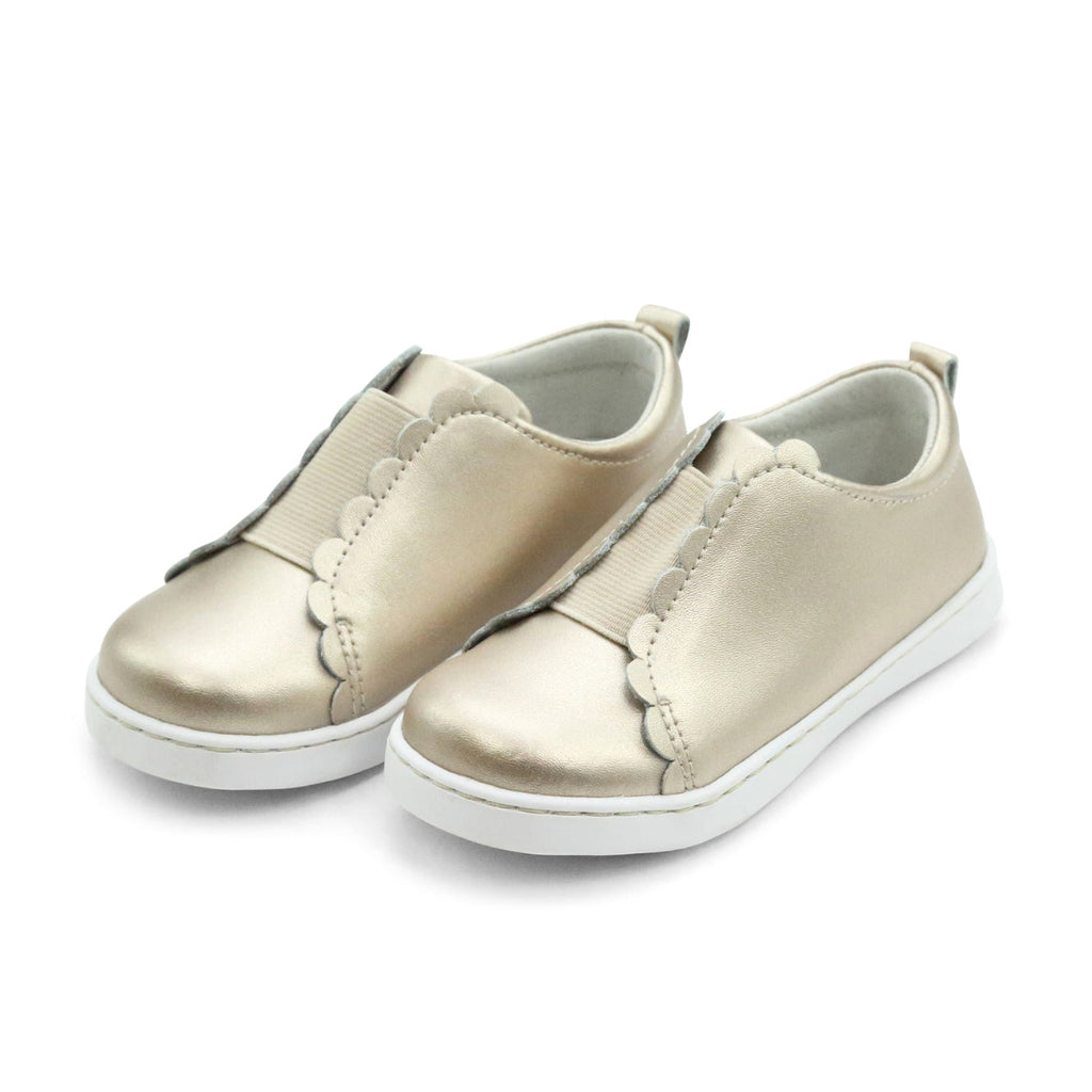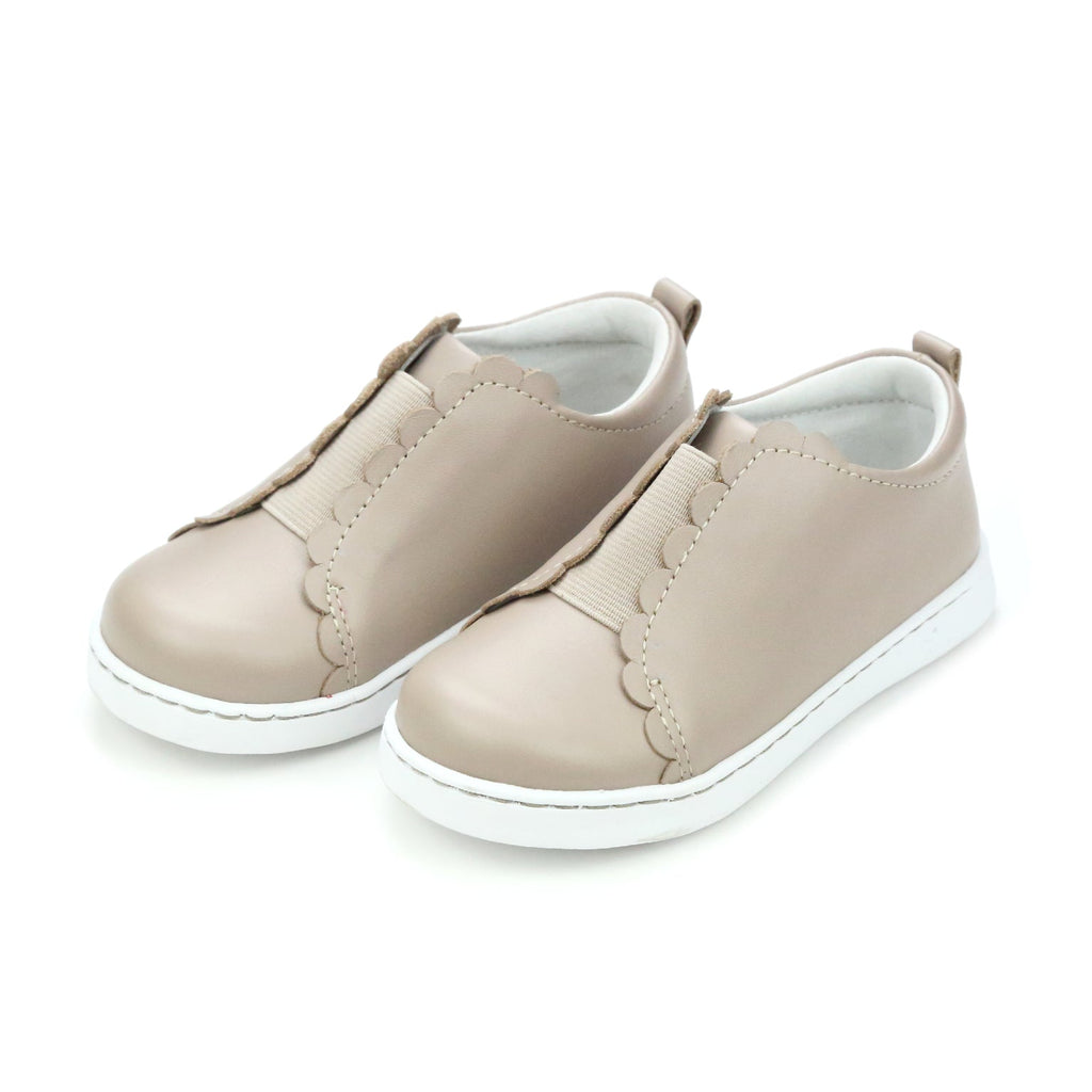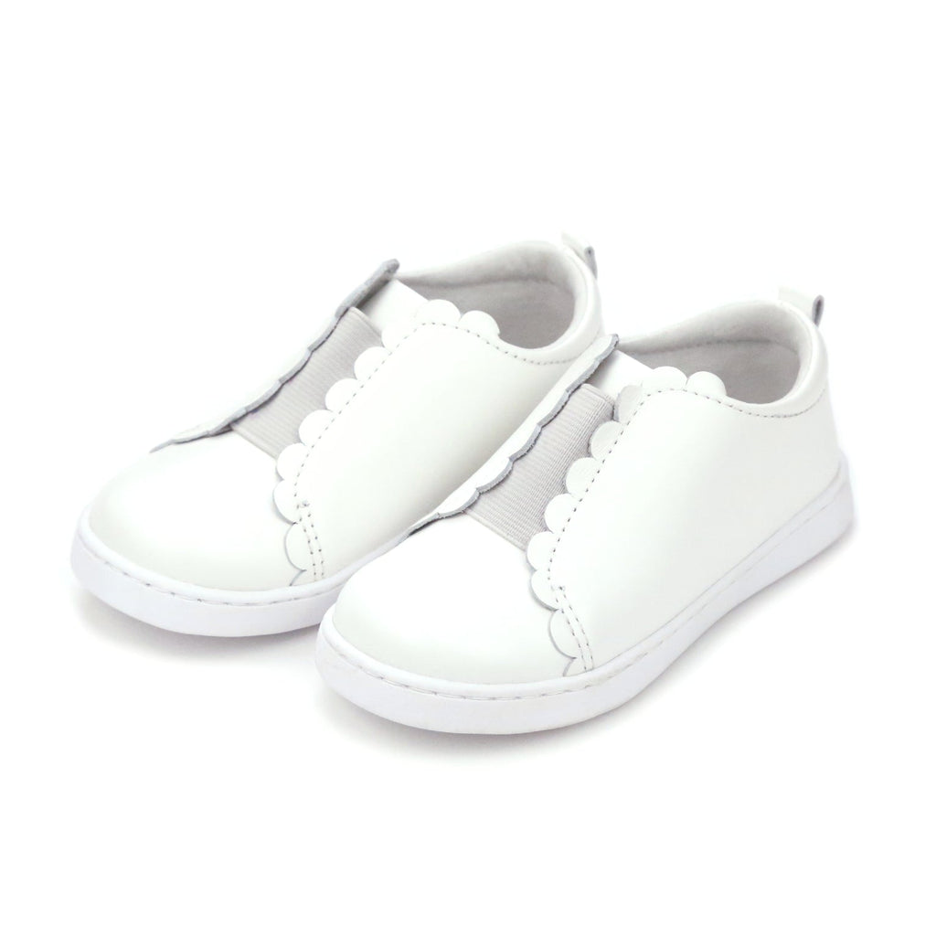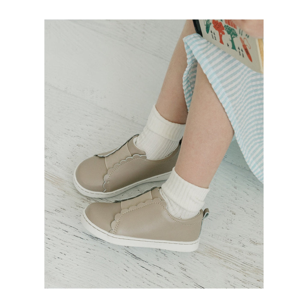 Scalloped and sweet, sister to the Caroline, the the Phoebe is the first slip on sneaker in our collection. We love the matching elastic for a semi-sporty look.
