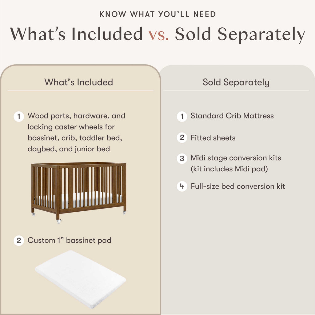 Sold Separately: Standard crib mattress, fitted sheets, and optional midi crib and full-size bed conversion kits.